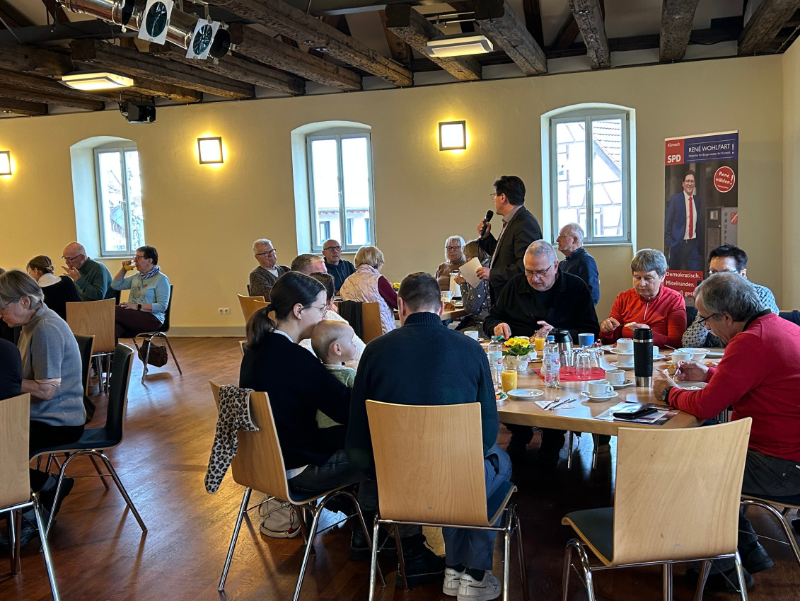 Trotz relativ widriger Wetterverhältnisse war der Saal im Alten Rathaus bis auf den letzten Platz belegt, das große Frühstücksbüffet nach drei Stunden fast abgeräumt und bei einem Gläschen (alkoholfreien) Sekt wurde mit den anwesenden Kandidatinnen und Kandidaten der KürnachSPD angeregt debattiert. Die bauliche Weiterentwicklung Kürnachs, Pläne für eine weitere Gestaltung am Friedhof, senioren- und jugendpolitische Themen – die Gespräche waren spannend, sie waren anregend, sie waren manchmal auch von unterschiedlichen Auffassungen geprägt, aber sie waren immer respektvoll und herzlich. Danke an alle Beteiligten!